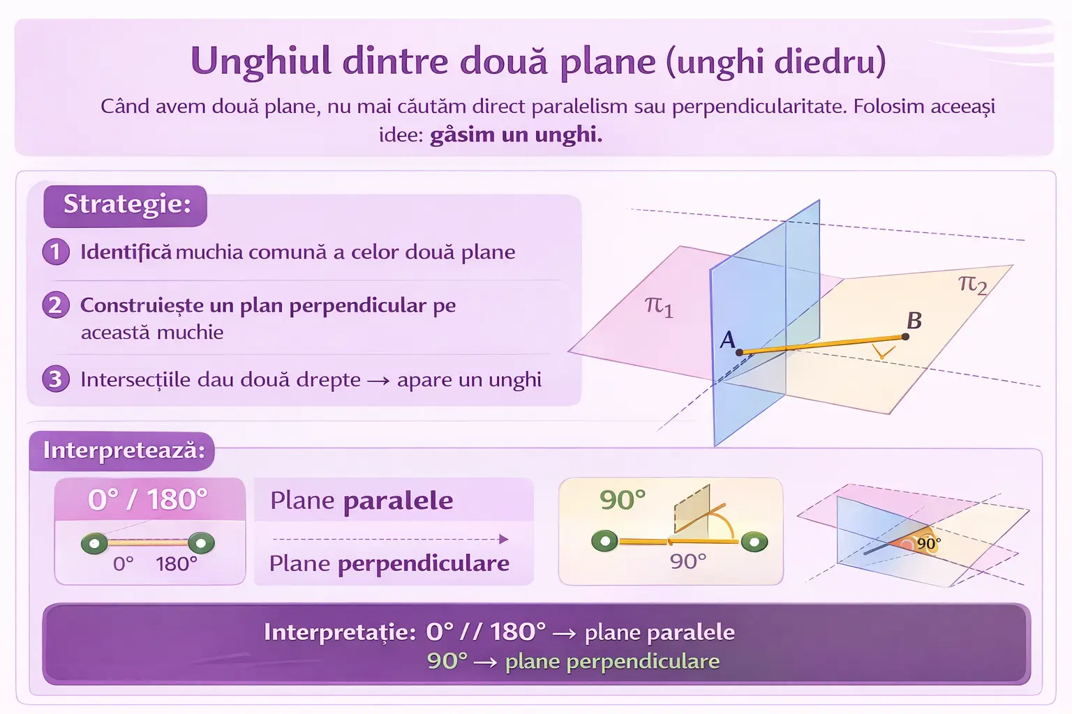 Când avem două plane, nu mai căutăm direct paralelism sau perpendicularitate. Folosim aceeași idee: găsim un unghi.